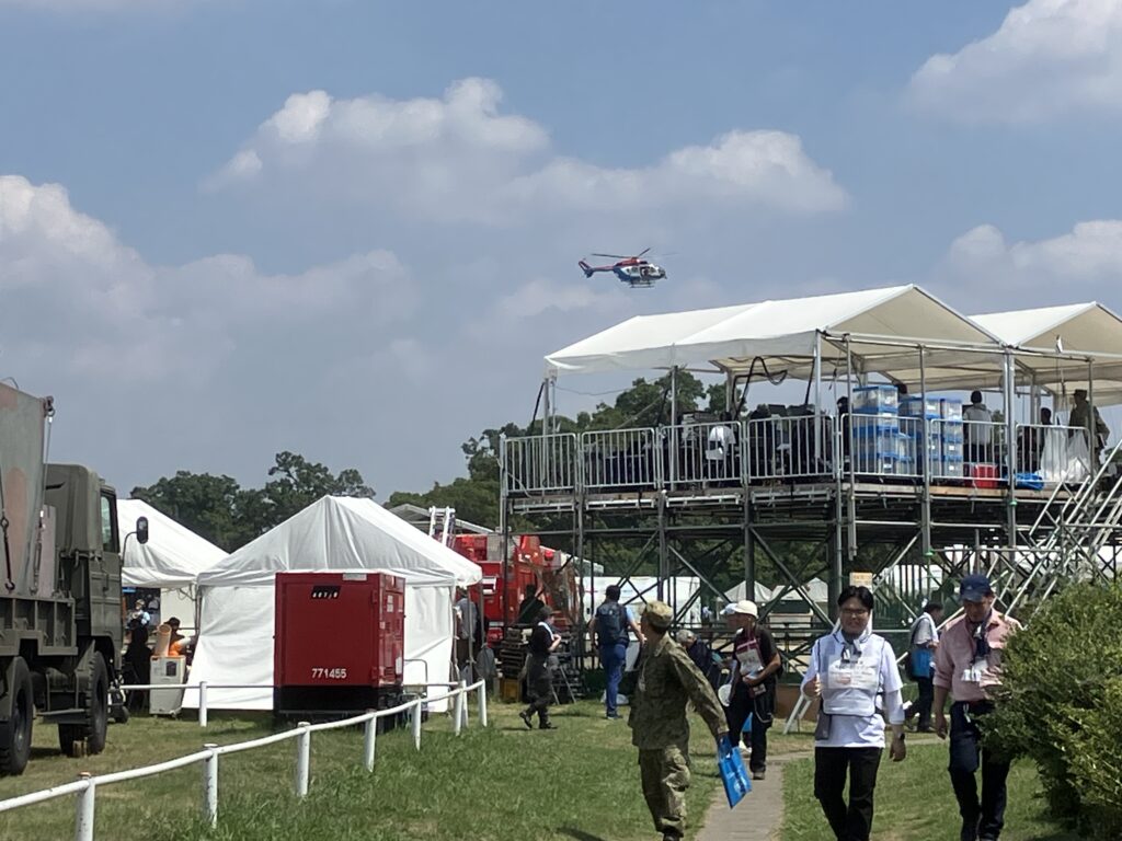 9月1日、「9都県市総合防災訓練」が荒川総合運動公園で開催。桜区自治連が参加しました。朝9時過ぎにサイデン化学アリーナで避難所体験訓練を実施。その後、荒川総合運動公園に移動し、「9都県市総合防災訓練」に参加。防災フェア・防災体験・実働訓練を見学しました。ヘリコプターで石破首相も来訪、猛暑の中での盛大な訓練となりました。