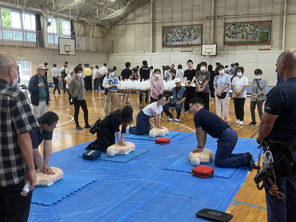 10月4日、土合小で「避難所運営訓練」が行われました。出席者は150人ほど。災害時を想定して、車椅子や担架の搬送訓練、三角巾の使い方、AED訓練などが行われました。